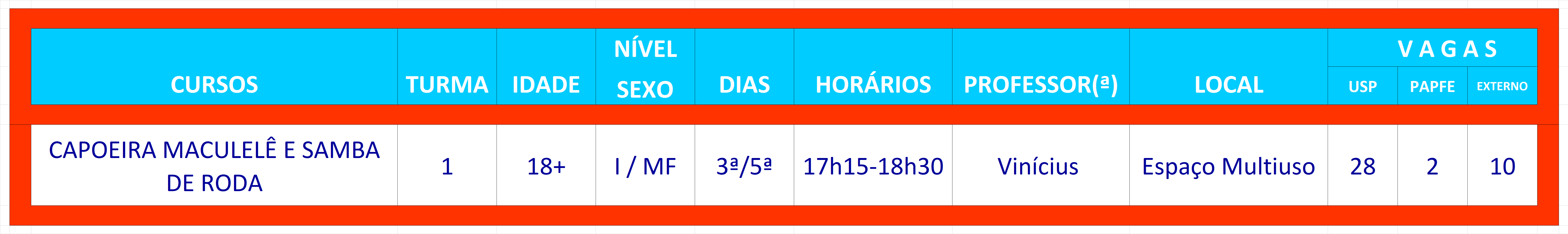 O Curso tem por objetivo promover o aprendizado dos fundamentos básicos da Capoeira, do Maculelê e do Samba de Roda, seus movimentos, ritmo, cantos, toques, história e filosofia.
