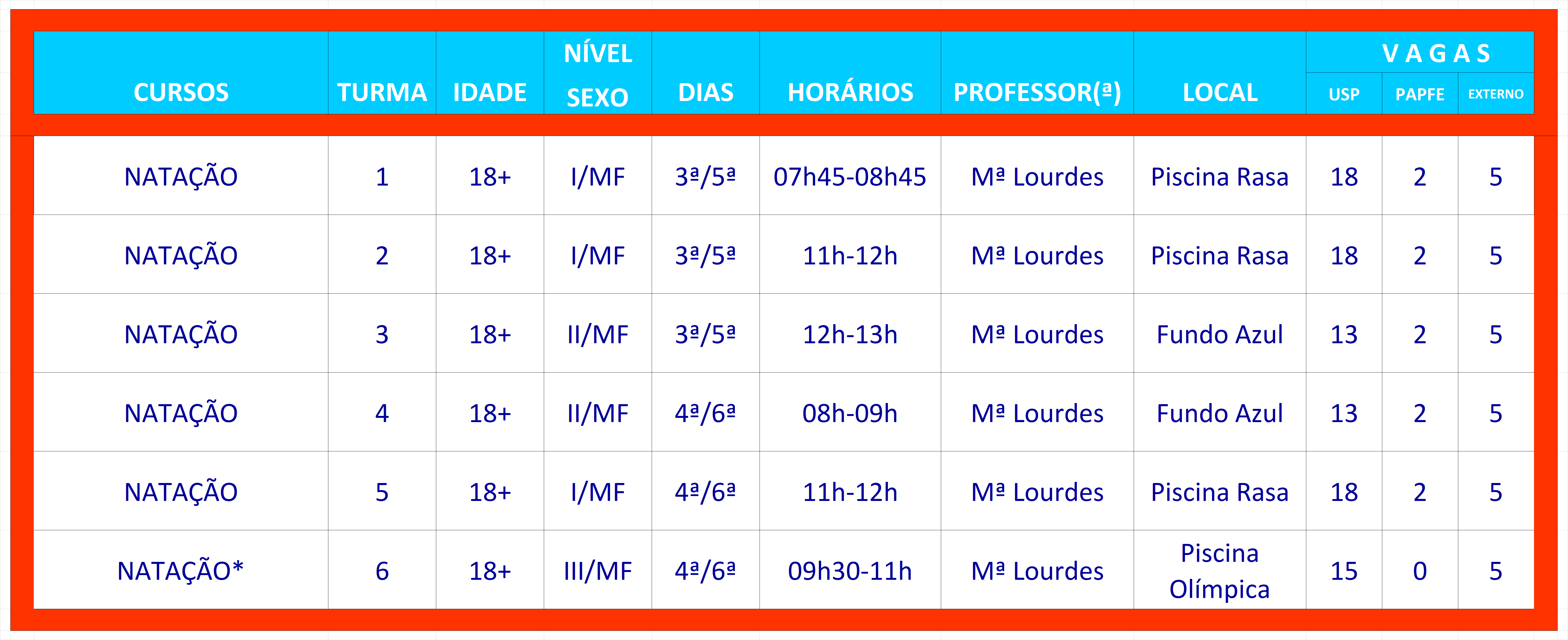 Turma *6 – procurar a professora no dia e horário de aula para retirar autorização no período de 23 a 27 de fevereiro de 2026, a inscrição é presencial na sala 09 do velódromo de 2ª a 6ª das 08h30 às 16h30 ou encaminhar a filipeta com a foto da carteira no e-mail curscepe@usp.br.