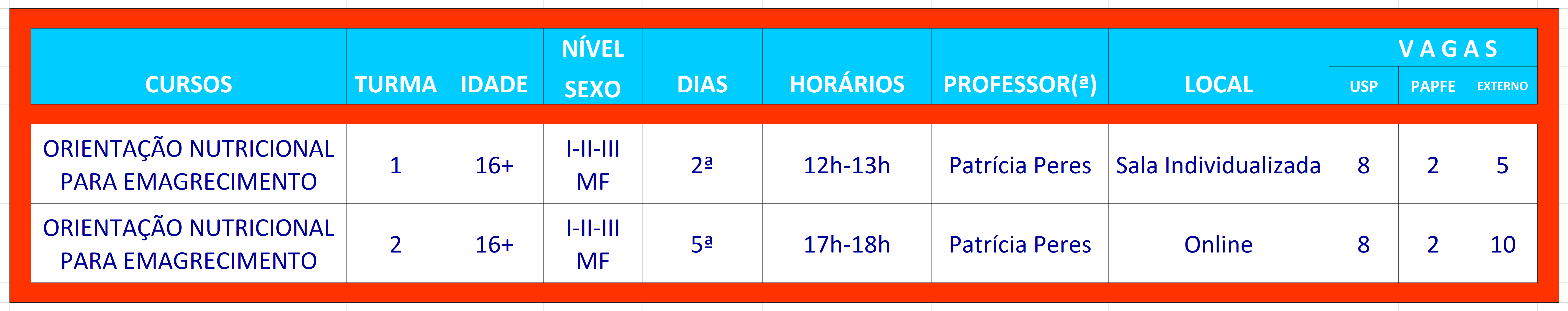O curso tem como objetivo proporcionar orientação nutricional para indivíduos obesos ou com sobrepeso. Após as avaliações antropométricas (IMC), de hábitos alimentares e de saúde, são propostas metas alimentares, visando à mudança de comportamento e, consequentemente, ao emagrecimento.